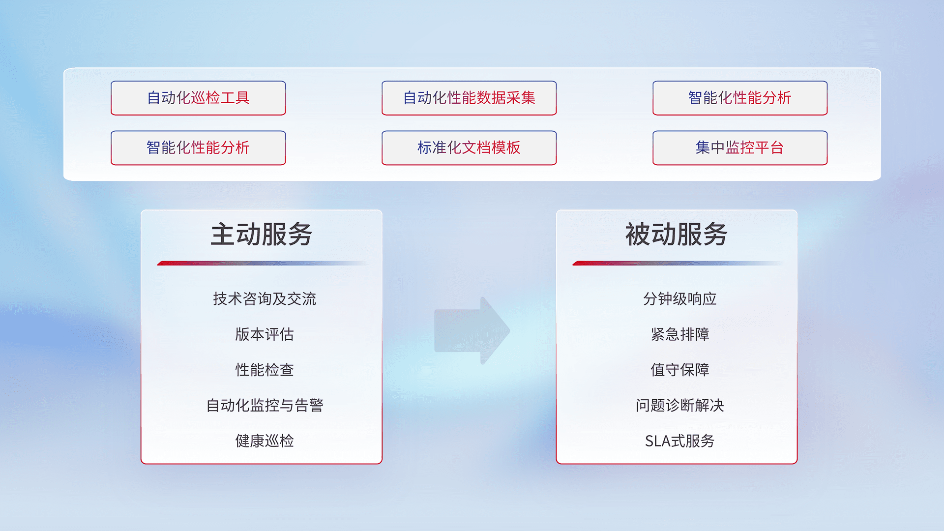 智能化工具和标准化文档,,,保障服务质量,,提供主动服务(包含技术咨询、、版本评估、、、性能检查、、、自动化监控与告警、、、、健康巡检)和被动服务包含(分钟级响应、、、、紧急排障、、、、值守保障、、、问题诊断解决、、、、SLA服务)。。。。